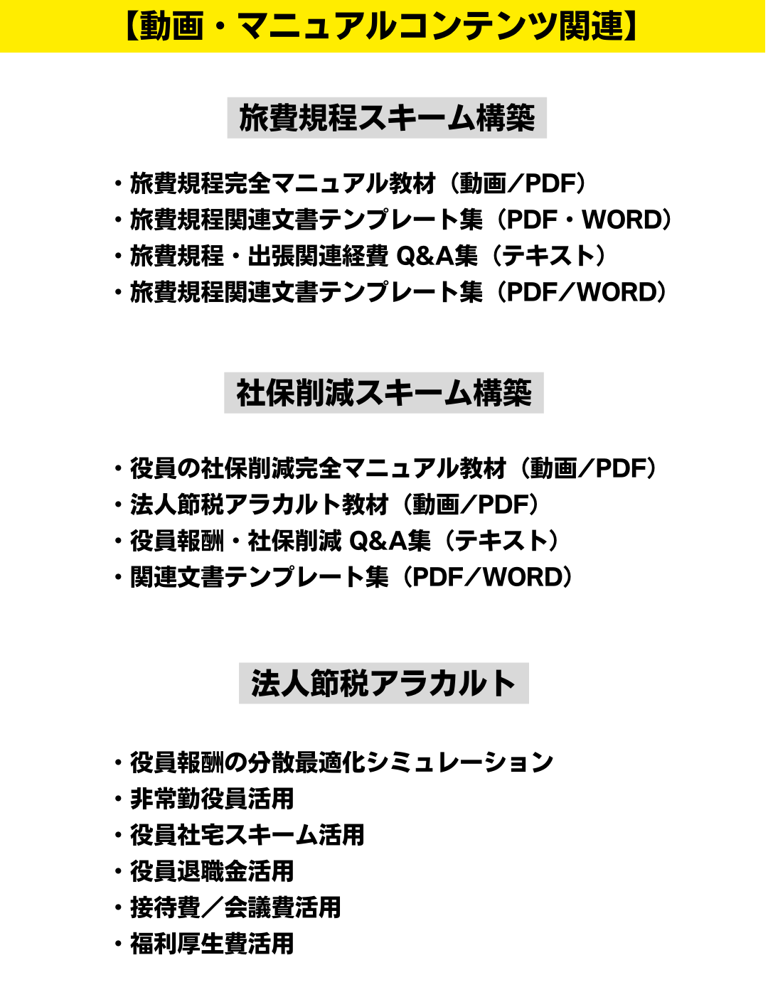 こちらは、各節税策に必要な考え方や導入の手順、または判例などの税務調査対策を簡潔にまとめた動画とテキストのコンテンツです。